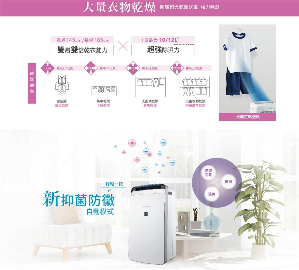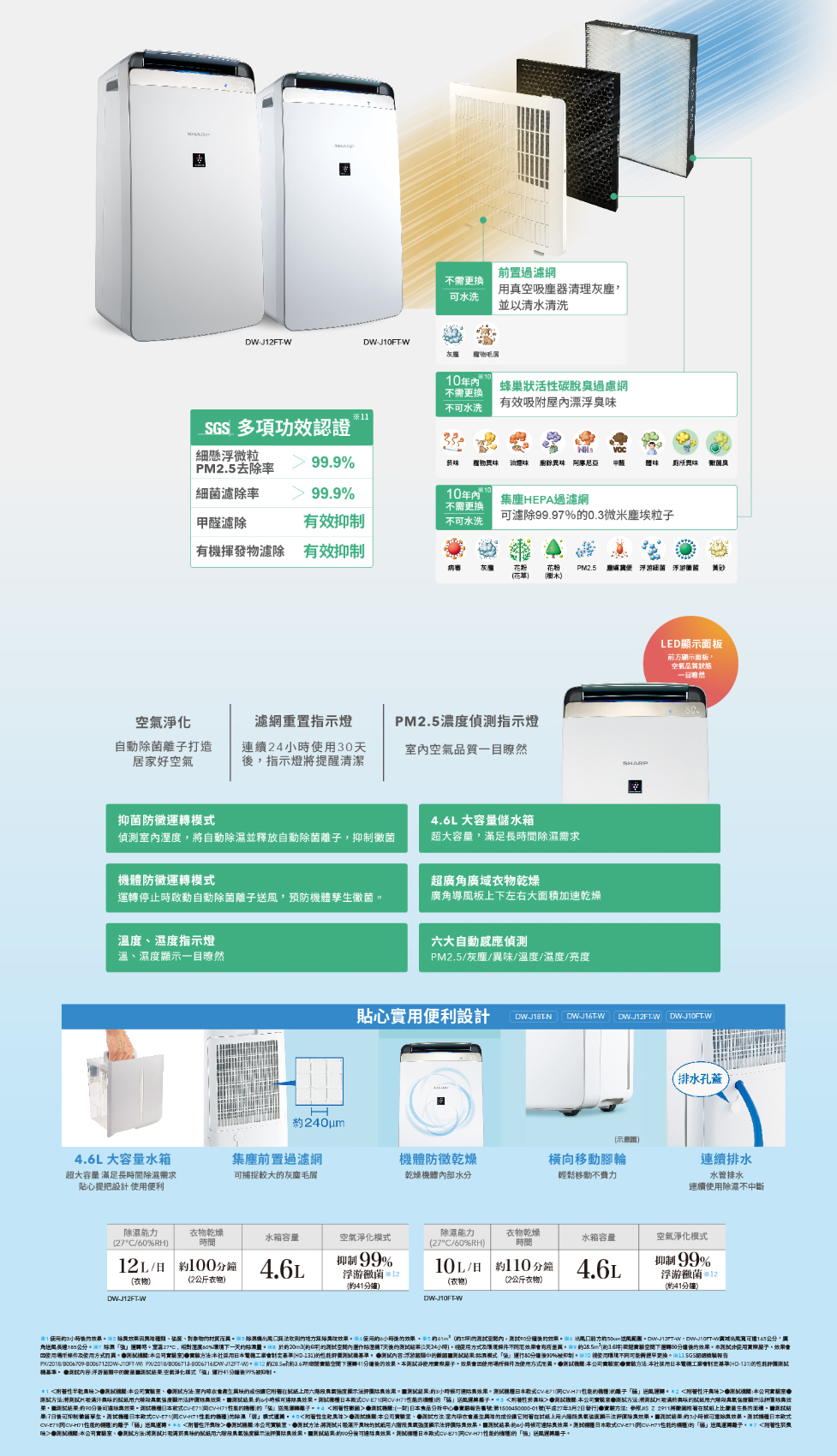 | 【夏普 SHARP】10L 自動除菌離子空氣清淨除濕機 DW-J10FT-W-六大自動感應偵測:PM2.5/灰塵/異味/溫度/濕度/亮度,4.6L大容量儲水箱:超大容量,滿足長時間除濕需求團購首家承諾 售價:11599 我要購買 |